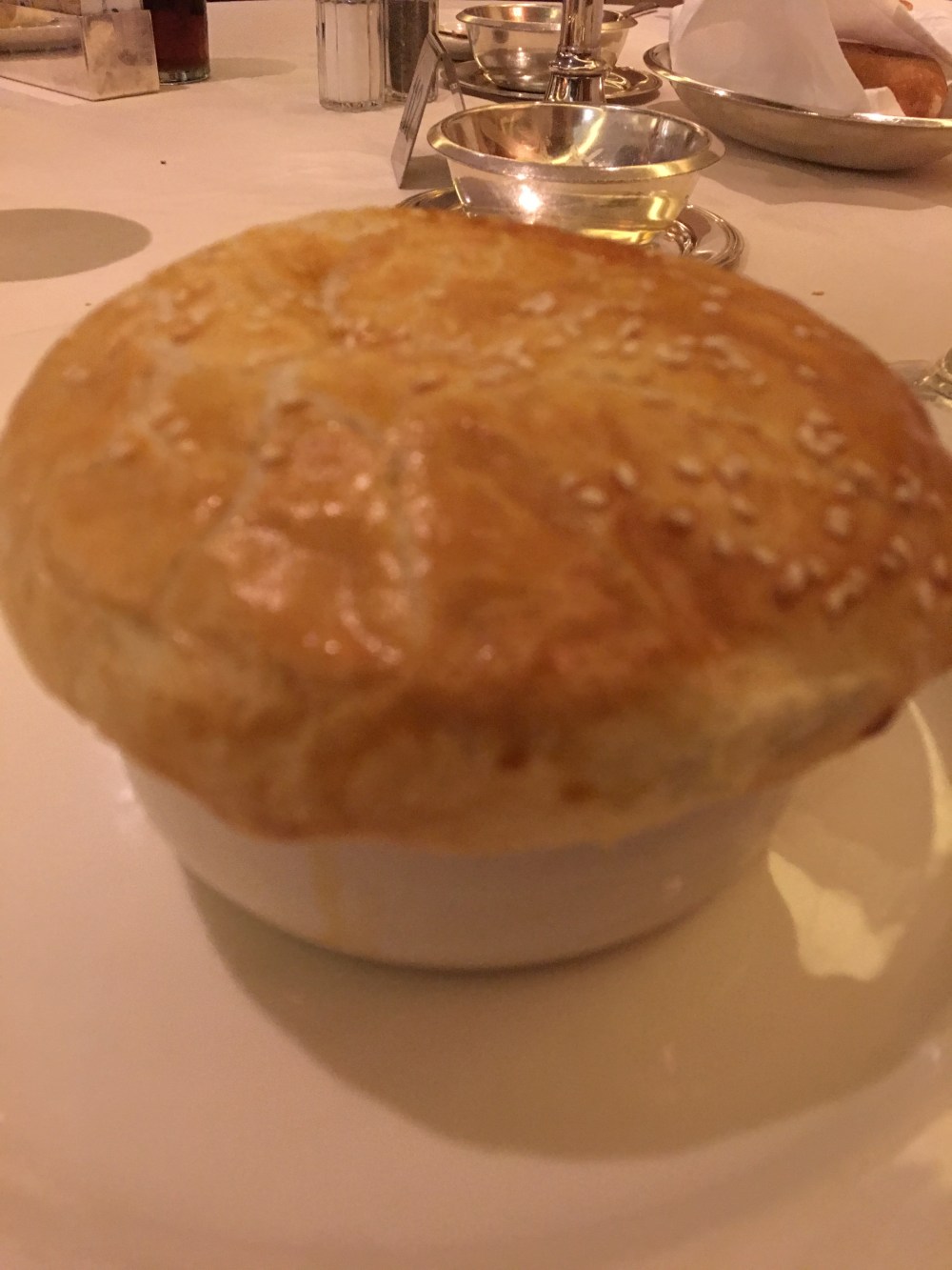 Yesterday, we had dinner in the Bordeaux Dining room, where we will have most of our dinners at 5:15 each evening. (We have early seating; Princess also has a late seating at 7:30 and they also offer Anytime Dining) With the Island Princess, most evenings one of the choices of entrees was created by Chef Curtis Stone. On some Princess ships, Chef Curtis Stone has a restaurant called “Share”. Last night I chose his “Chicken & Leek Pot Pie”