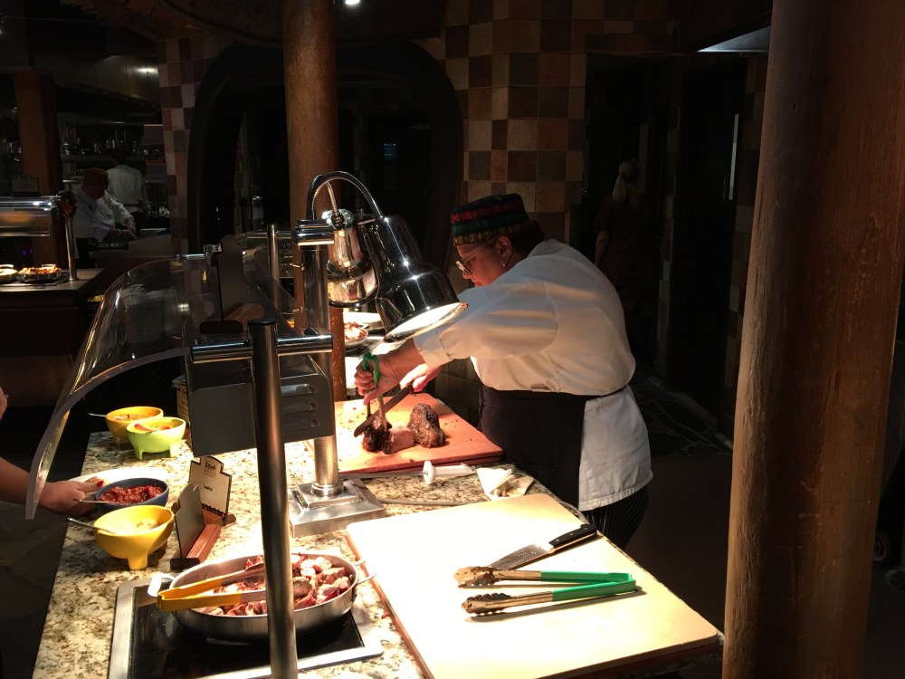 Boma opens for dinner at 5:00 PM. I usually try and get my reservation right at 5:00 so that I can watch the drummers open the restaurant with their welcome show. I filmed a bit of it that you can watch below. You don’t have to have reservations to see the drummers, just be in the restaurant’s lobby a few minutes before 5:00PM…or better yet, watch from Victoria Falls, Jambo House’s own bar, which is located off of the lobby with views (and smells!) of Boma below.