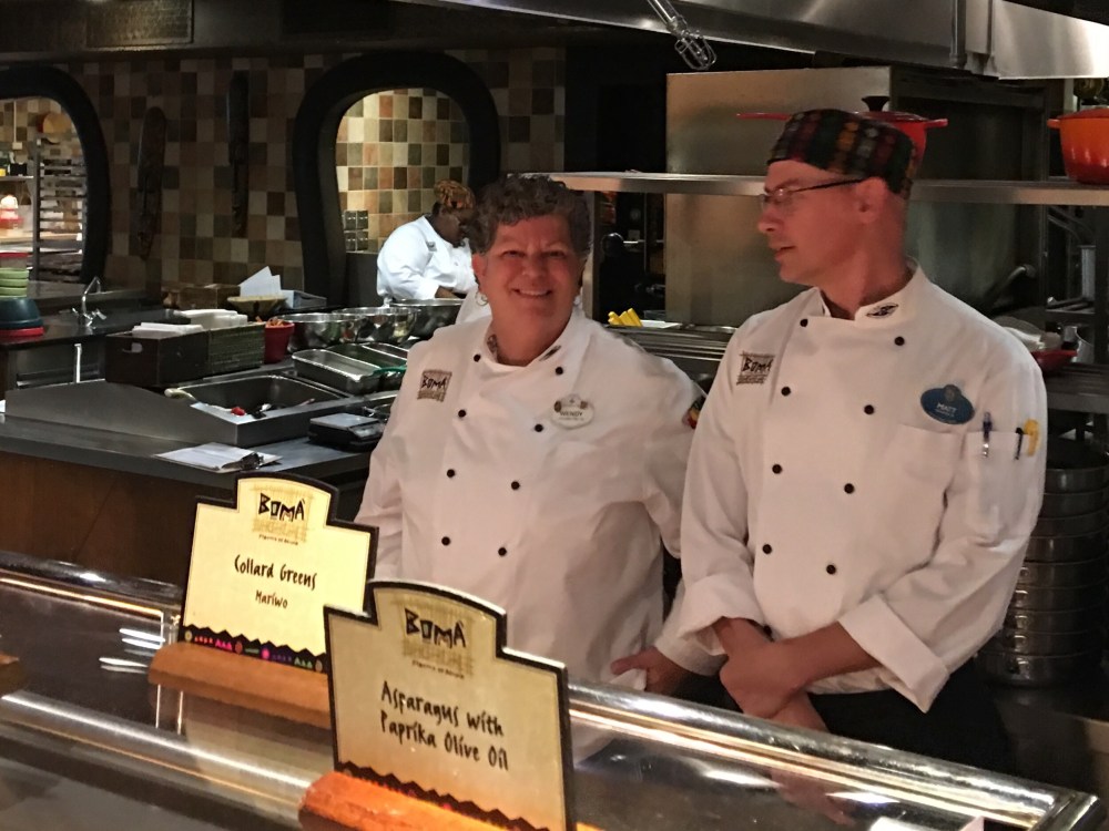 The chefs are wonderful to work with at Boma. They are there onstage to help with suggestions, suggest certain items & to work with food allergies. In fact all of the chefs at Disney restaurants are very good with allergies. Just be sure to tell your server what your allergic to when you sit down!
