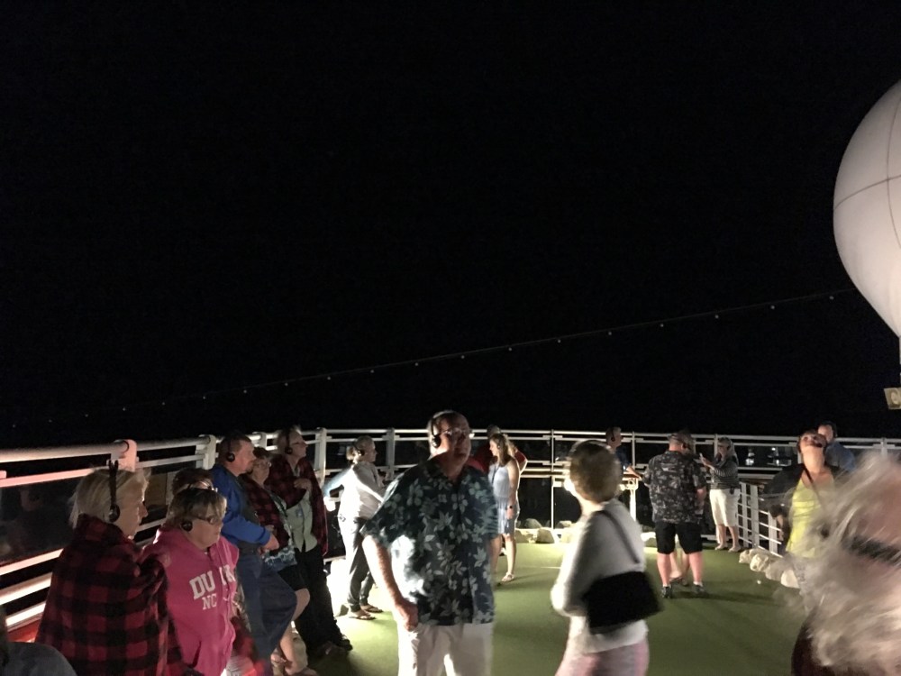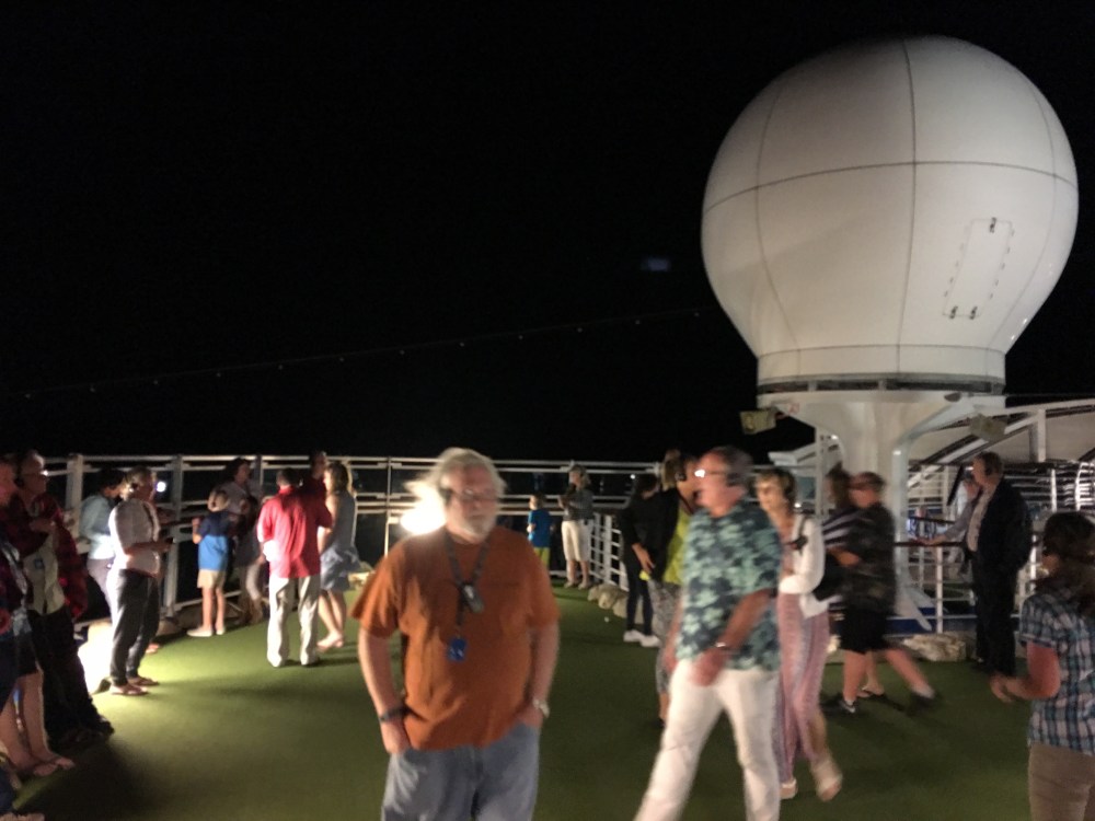 And, that’s exactly what they did…I felt as if I had been on a cosmic voyage! The event that I went to took place at about 10:15PM one night while at sea. A group of about 35 adults (along with several children) met up on the Sports deck. A headset was given out, along with a few safety instructions. After the safety spiel, we went to the topmost deck to begin learning about the constellations. The ship’s assistant cruise director, Maddie, hosted the event, and via our headsets, we were able to listen to our virtual co-host, Hakeem Oluseyi who gave very informative “mini-lectures” about each constellation that was overhead and how to locate them. I especially loved Maddie’s enthusiasm. She said that this was her absolute favorite thing to do each cruise, and you could certainly tell. She was truly experienced, but the wonder on her face and in her voice was like she was seeing the stars for the first time.
