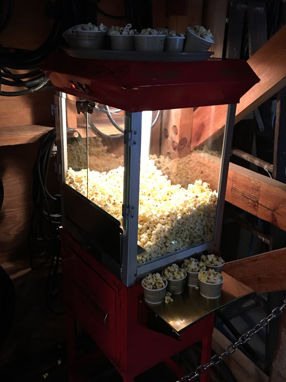I saw some self-serve popcorn on one side of the podium, and on the other a tall container of ice water with paper cone cups. (We need to remember this on hot days…just come in and grab some water to stave off dehydration!) I grabbed some popcorn and some water to stave off the hunger & thirst for a bit. About the time I ate about 10 kernels of popcorn, I got a text that my table was ready. So, instead of waiting 30-40 minutes for a table, I waited about 3 minutes! Awesome!
