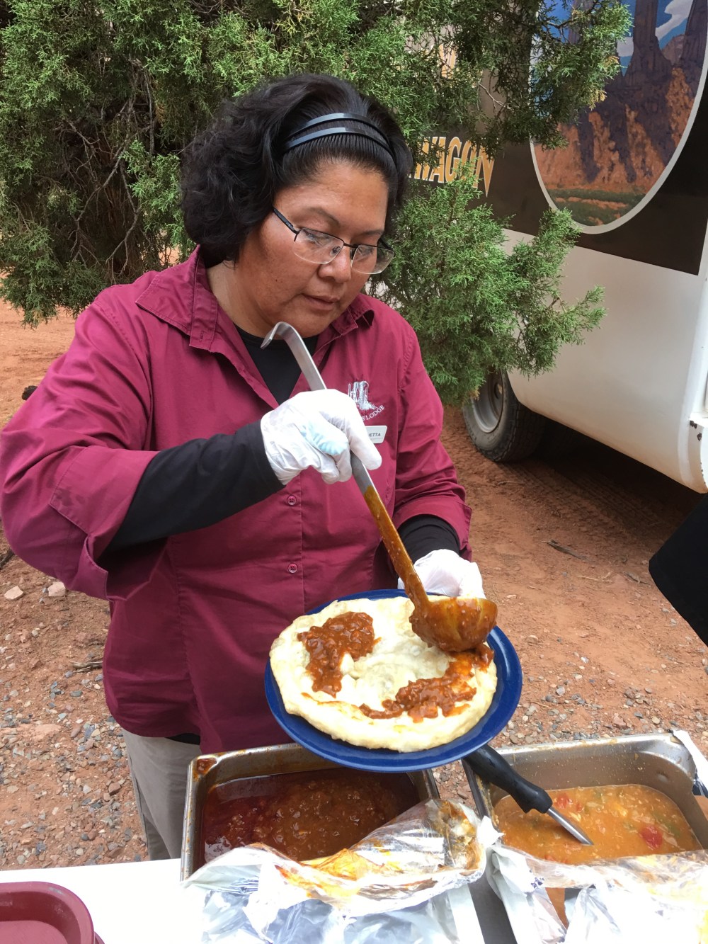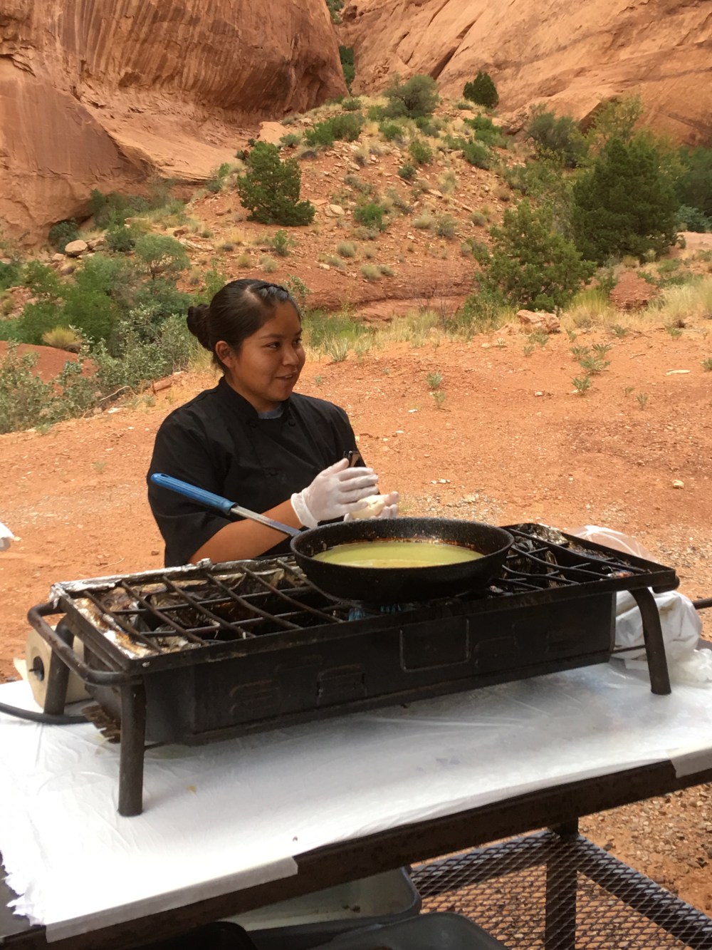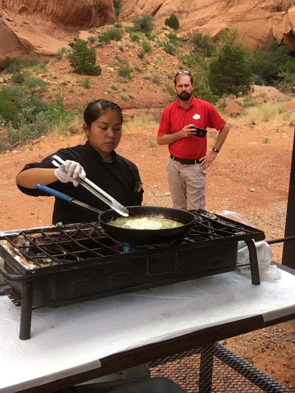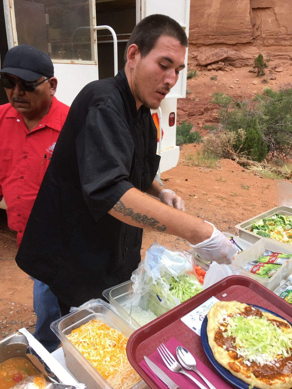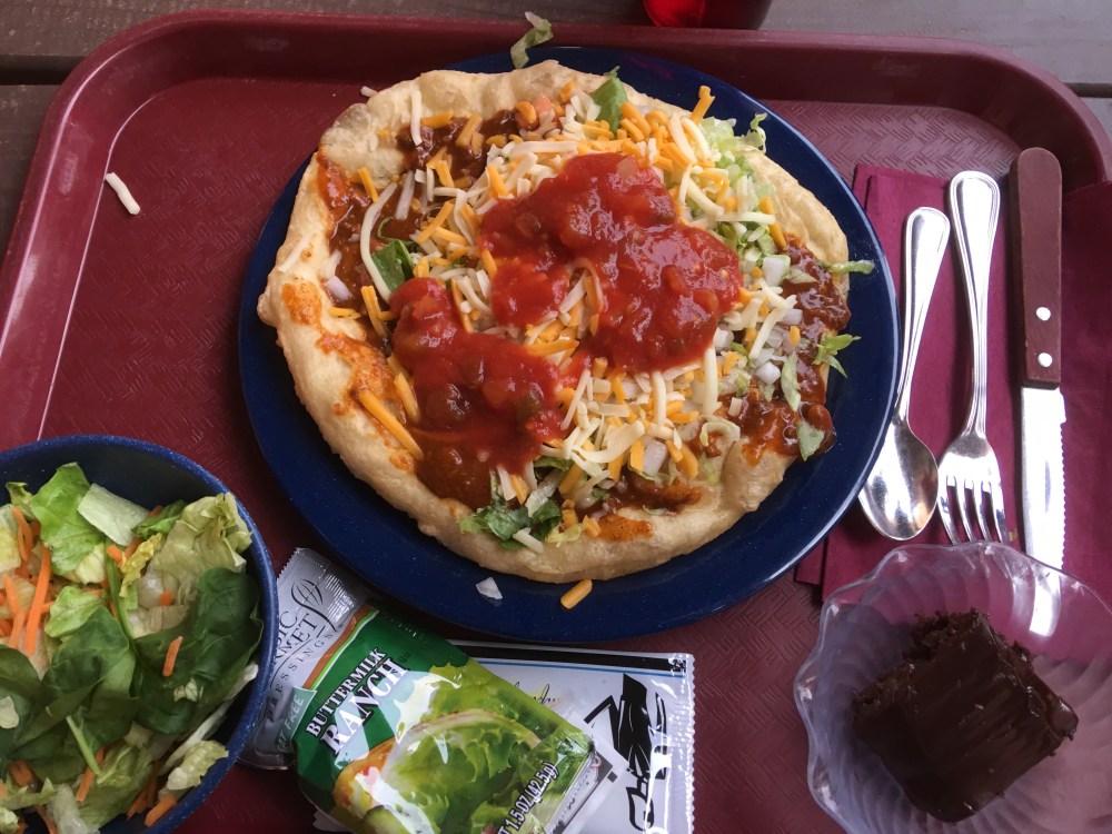 Before we knew it, it was time for Navajo Tacos. I didn’t know what to expect, but basically it was Navajo fried bread, with chili, cheese, and lettuce, onions and tomatoes, topped with salsa. Delicious.