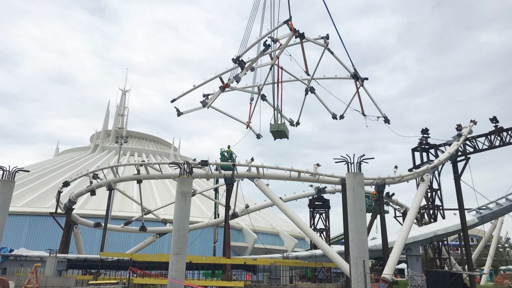 The Magic Kingdom Park skyline looks a bit different today now that the crew from Walt Disney Imagineering has reached a major milestone in the development of TRON Lightcycle / Run at Walt Disney World Resort. Here you can see this image of the first piece of canopy being installed in what will become an instant iconic attraction and portal to The Grid here in Tomorrowland.