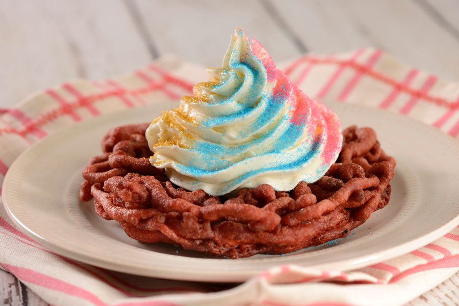 - Red Velvet Funnel Cake topped with Cream Cheese Icing and Pixie Dust (New)