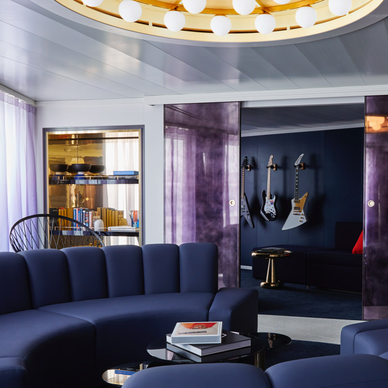 This is it. This is the suite. Positioned at the most forward part of the ship — the views are, to put it simply, unrivaled. Get lost watching the waves from your outdoor hot tub or create a new sound in your personal music room. But don’t worry, you can find yourself again the next morning as you meditate alongside the waves on your sprawling private terrace.