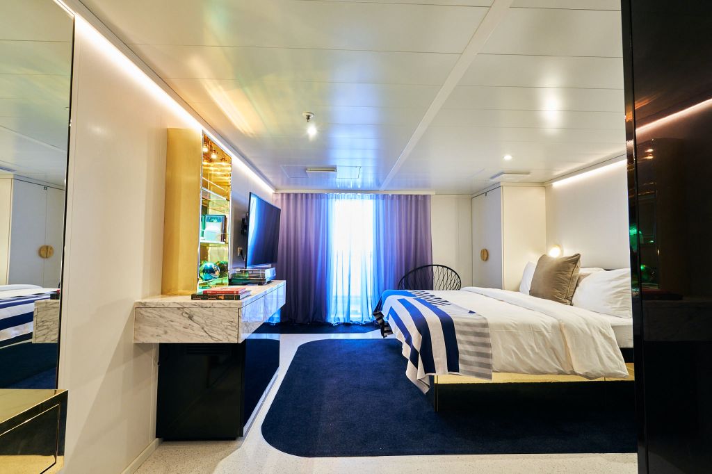 Richard Branson’s Virgin Voyages new ADULTS ONLY cruise line is where the design of superyachts meet luxury cruise ships. Their RockStar Quarters bring you the lifestyle you deserve! With accents of brass, stunning marble bathrooms, spacious stargazing terraces, champagne tables and exclusive treatments, these VIP Suites are for you you! Live out your holiday dreams and be the RockStar you are. There are two categories of suites available on Virgin’s ships, Mega RockStar Quarters and RockStar Quarters. In this article, we’ll be talking about Virgin’s RockStar Quarters. Check out the Mega RockStar Quarters here.