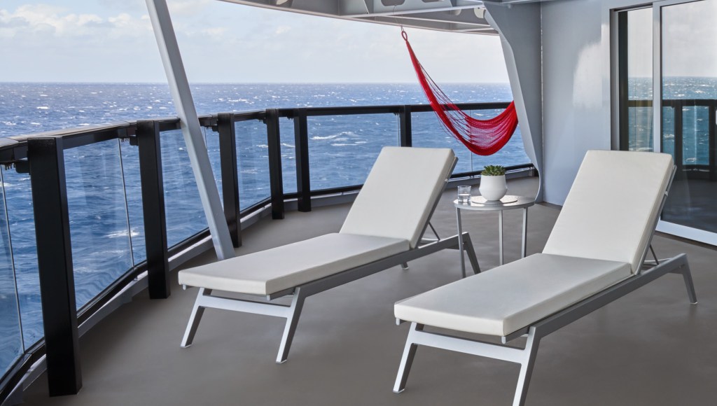 Wrapping panoramic views from the corner of the ship are emphasized by Virgin’s design choices — from their custom interior wicker chairs to the beautiful, hand-woven hammocks on the terrace, their pieces were designed with thoughtful space to maximize sea views from any angle.