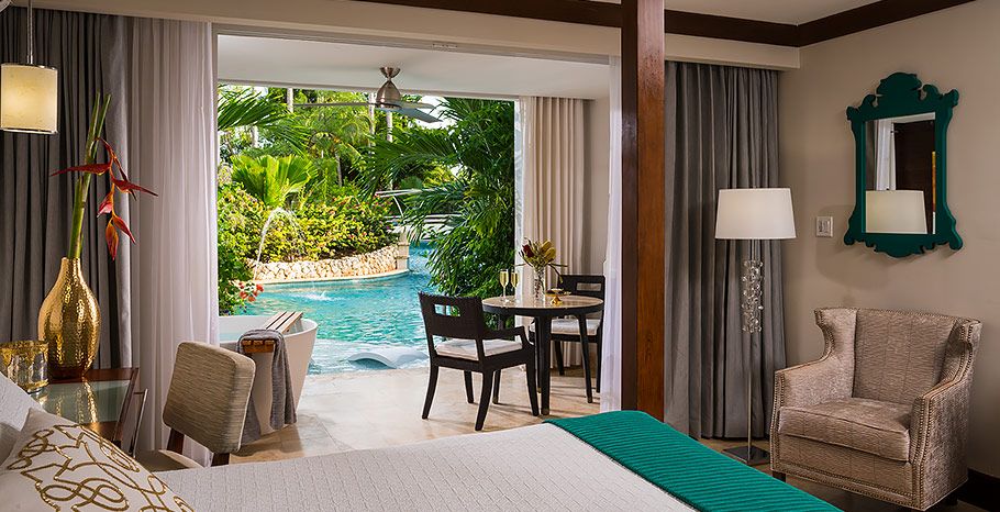 Go right from your suite into the pool at Sandals Royal Caribbean in Montego Bay with your own swim-up suite. For couples who want to save money when booking a suite in this category, take a look at the Walkout Swim-Up Crystal Lagoon Honeymoon Butler Suite (personal butler and 24-hour room service included) and the Swim-Up Crystal Lagoon Honeymoon One Bedroom Butler Suite. Both of these suites will put you as close as ever to the ocean and include tropical garden views as well.