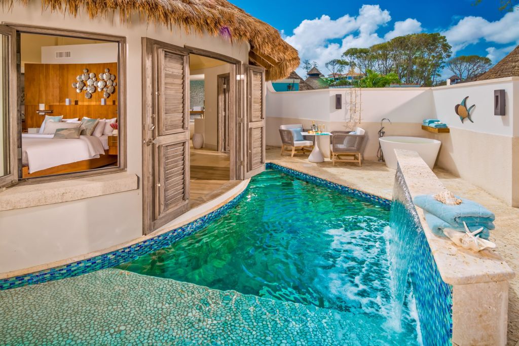 Sandals Halcyon Beach in Saint Lucia is one of those all-inclusive resorts with a private plunge pool that couples can enjoy. This resort definitely belongs on the list of resorts with affordable private pools as there are several affordable suites available in this category. This includes the Beachfront Honeymoon Butler Room w/ Private Pool Sanctuary (I love the shimmering mosaic tile and soothing cascade water feature!) and the Honeymoon Butler Room w/ Private Pool Sanctuary. The latter of these has a spacious deck with stylish patio furniture and a pair of sun loungers, so you’ll be able to soak in some sunshine and later settle in for some al fresco dining.