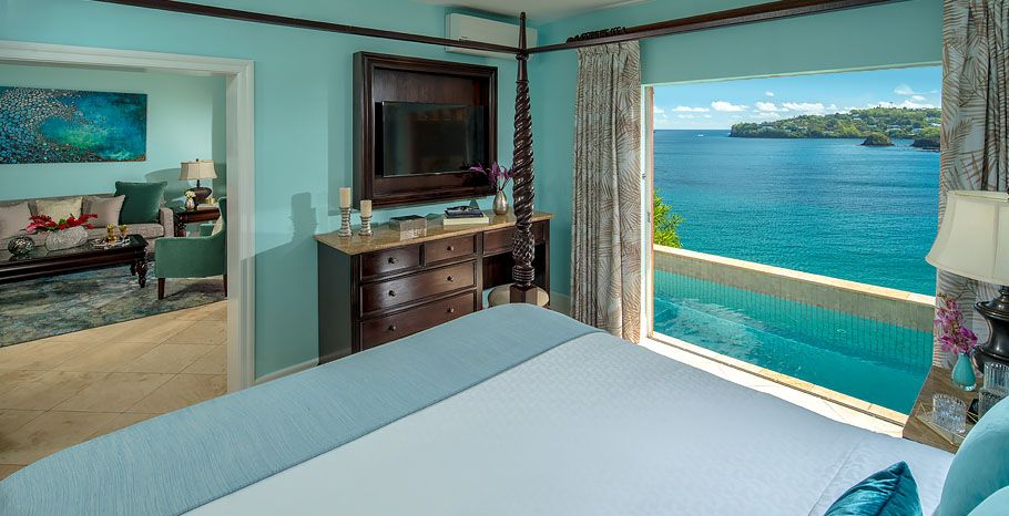 Sandals has many resorts that offer rooms or suites with gorgeous private plunge pools. This list includes Sandals Regency La Toc, Sandals Halcyon Beach, Sandals Ochi, and Sandals Grenada. Each of these resorts has amazing views, so being able to take them in from your own private pool will definitely be a vacation highlight. Here are some of our favorite affordable options in this category: