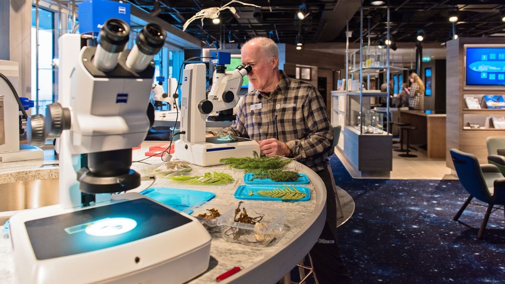 - Use the ship’s Science Center, which features an extensive library and advanced biological and geological microscopes