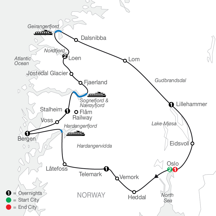 You’ve been looking for Dasher, Dancer, Prancer, and Vixen in all the wrong places. Pack your binoculars for Norway’s natural wonders, including its scenic Hardangervidda mountain plateau, home to Northern Europe’s largest stock of reindeer. Of course, this gorgeous expanse of land and its antlered residents aren’t the only gifts Norway bestows upon its guests—extraordinary fjords, serene lakes, gleaming glaciers, and thundering waterfalls are all part of the bow-topped package, and this breathtaking tour of Norway presents the most spectacular ways to see them. Cross the orchard-lined Hardangerfjord by ferry, witness the UNESCO-protected Nærøyfjord aboard a relaxing cruise, and revel in the spectacular Nordfjord views aboard the Loen Skylift, Norway’s newest aerial tramway. Beginning and ending in Oslo, this encompassing tour of Norway balances the country’s charming, timeless villages with the surprising architecture and energy of its capital city.