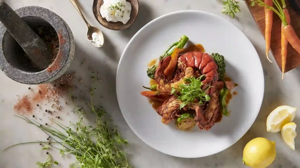 - Morimoto Epice Lobster Tails with lemon foam, seasonal vegetables and Morimoto Epice.