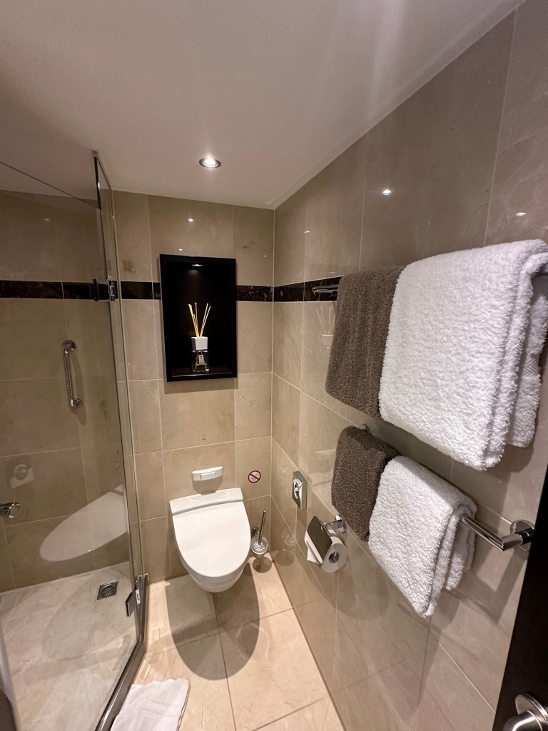 I feel like I need to mention the bathroom in my room. I mean cabin. Room? Cabin? It felt much more like a hotel room than a cruise cabin, so I keep saying room. My room was laid out perfectly (and the air conditioner was so capable…it was fantastic!! Whoever designed the room has definitely sailed on rivers before. I’ll talk more about the room in an upcoming post, but today, I want to tell you about the bathroom in my cabin.