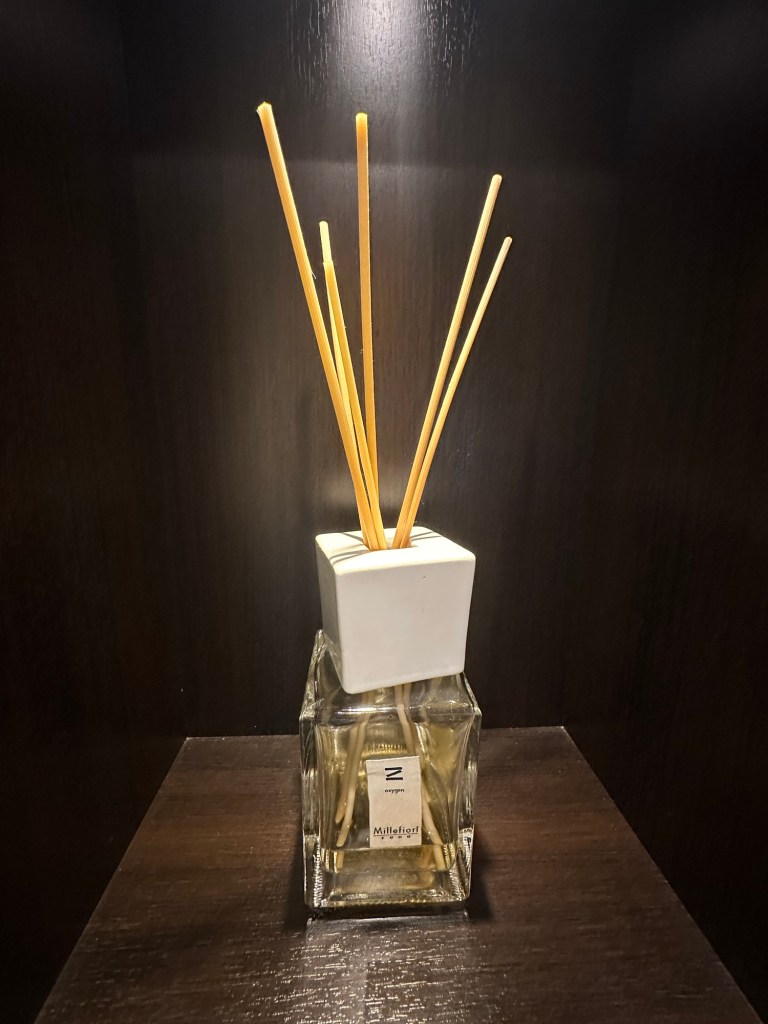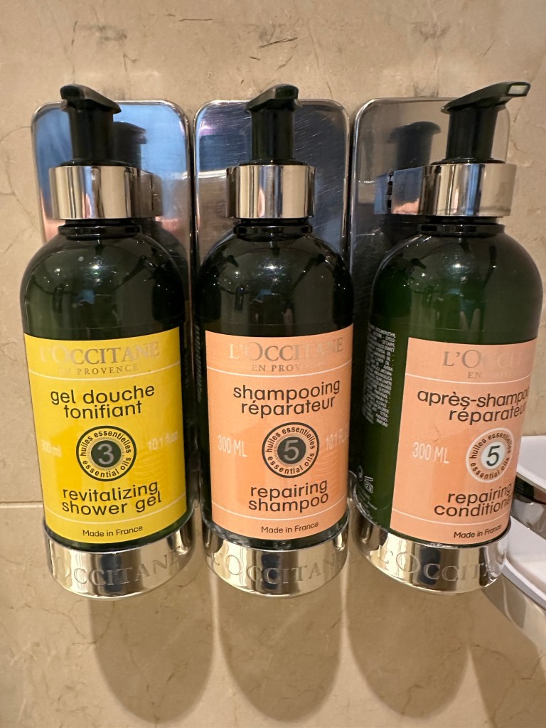 From the two different colors of towels (so you won’t get your towel mixed up with your partner’s towel), the amazing L’Occitane bath & body products, to the “pull out” trash can, this bathroom was perfect. The shower was amazing, with plenty of room…I did not feel like I was in a telephone booth! AVALON TIP: If you’d rather have bar soap, ask your room attendant! Mine supplied me with a bar of soap.