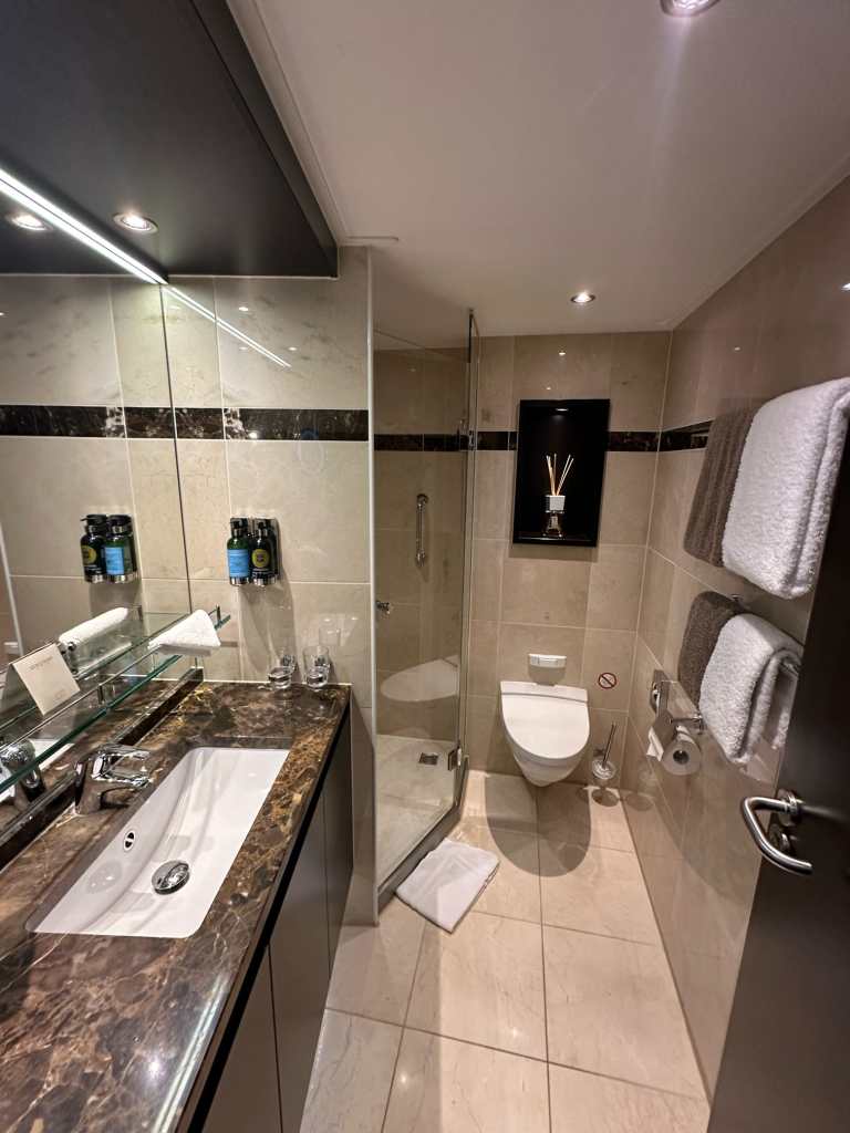 The bathroom deserves its own moment of appreciation too. Not only do they offer a larger-than-expected shower (hallelujah!), but the layout is smart, the lighting is flattering, and the mirror doesn’t fog up the second you turn on the hot water. It’s all these little things that make a big difference when you’re living out of a suitcase.