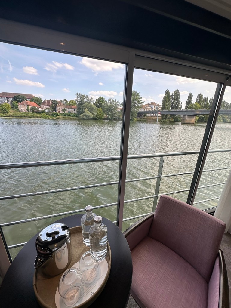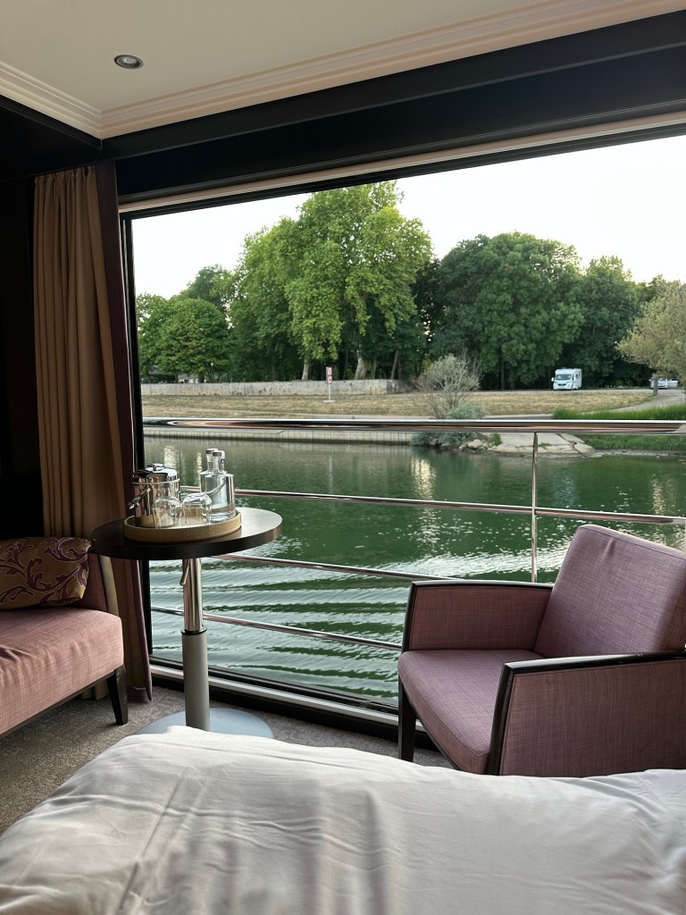 Now I’m all settled into my Panorama Suite, Avalon’s signature stateroom with floor-to-ceiling sliding glass doors that turn the entire room into an open-air balcony. As I write this, I’ve got the windows open, the breeze drifting in, and the Saône River slipping past in the twilight. There’s something so peaceful about this kind of travel—no rush, no unpacking and repacking, just the rhythm of the river and the excitement of what’s to come.