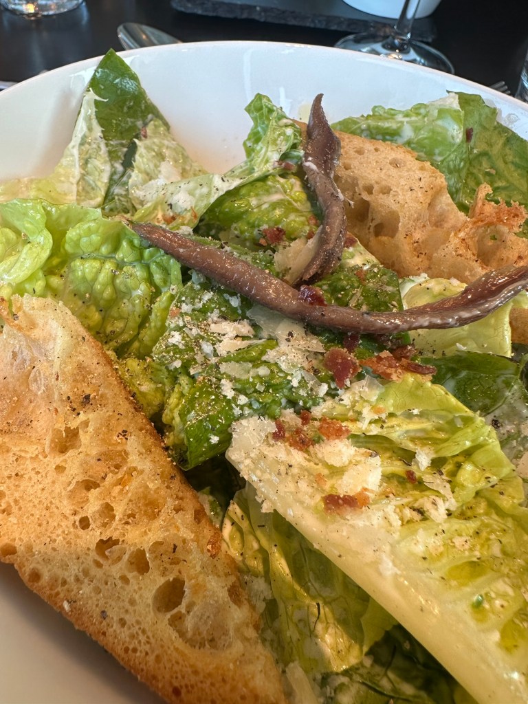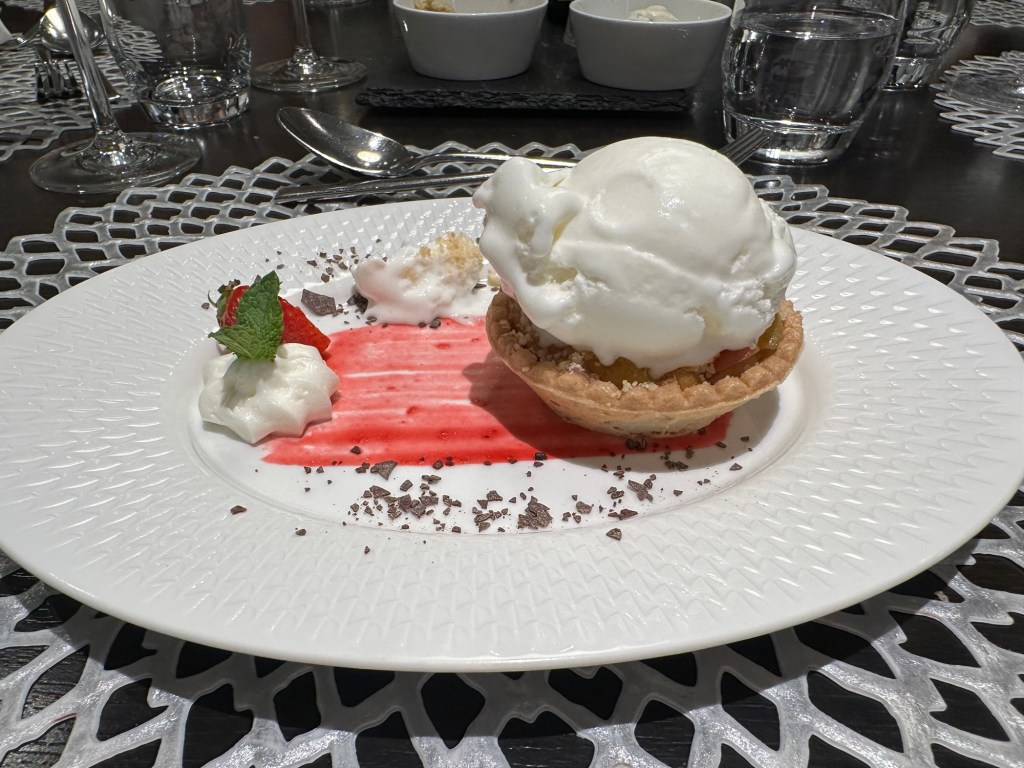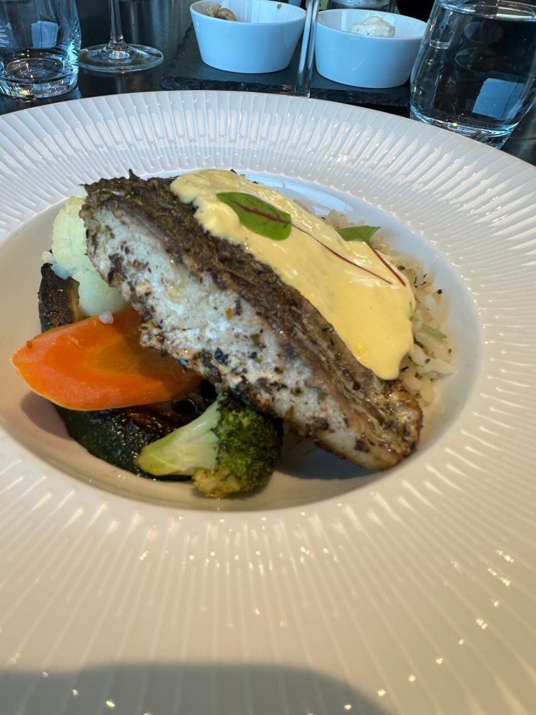 Dinner was delightful: a Caesar salad (the lettuce may have been a bit on the wilty side, but the flavor made up for it), a smooth and comforting cauliflower soup, and grilled fish with a delicate, flavorful sauce. For dessert, I chose the apple tart… because fruit is good for me, right? 😉