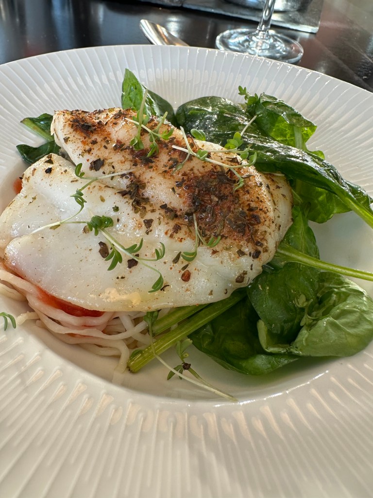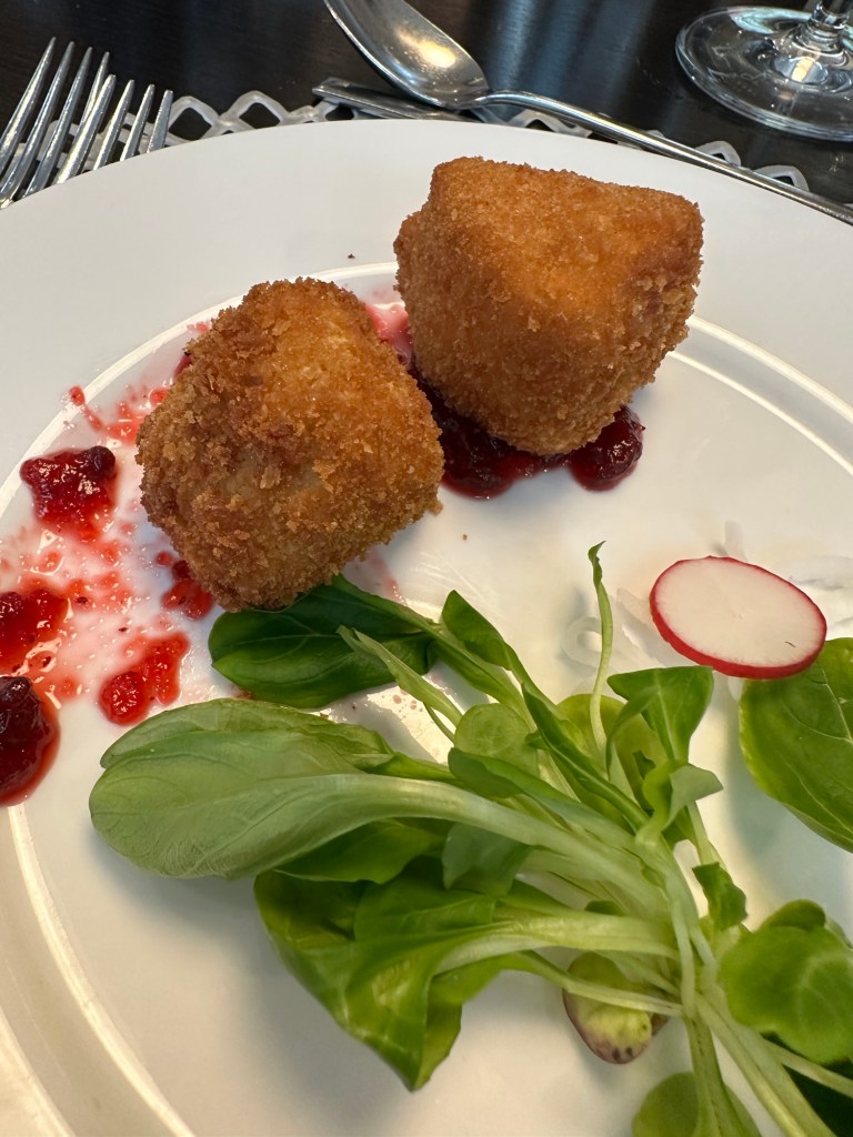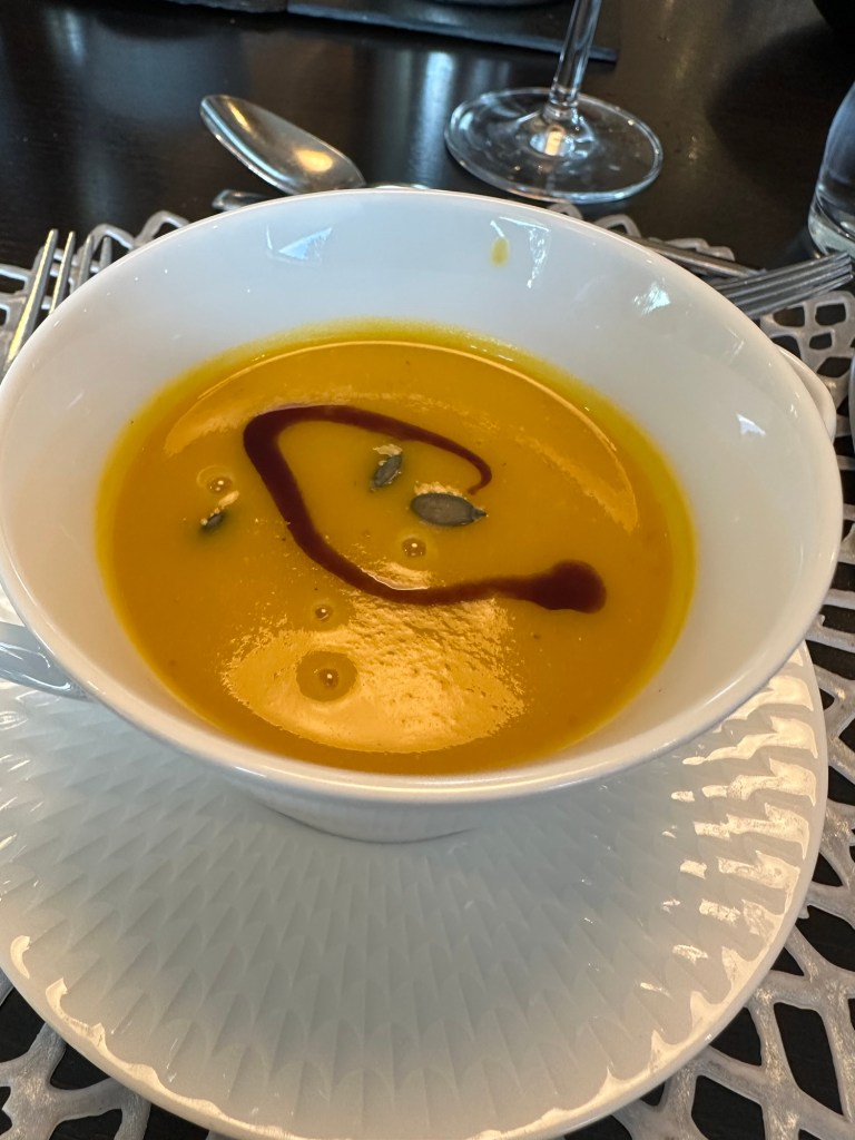 Dinner tonight was another highlight: fried Camembert with cranberry sauce, velvety pumpkin soup, a perfectly cooked piece of fish, and for dessert, a lovely peach Melba. I shared the meal with some new friends, and we lingered at the table talking for nearly 45 minutes after dessert. It’s those slow, unhurried conversations that make travel so special.