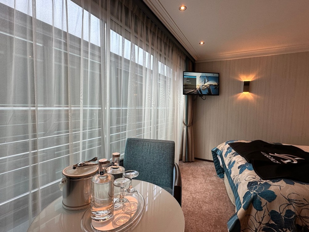 Now, let’s talk about Avalon Waterways—because this cruise experience truly stands apart. I’m staying in one of their Panorama Suites, and let me tell you—it’s a game changer. These suites are designed with beds facing the wall-to-wall panoramic windows, so I wake up each morning to peaceful river views instead of a wall. There’s no balcony taking up the space—just an open-air feeling and uninterrupted scenery, from the comfort of my bed or my sitting area. It’s such a thoughtful, elegant way to cruise.