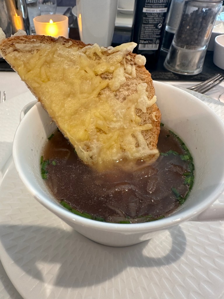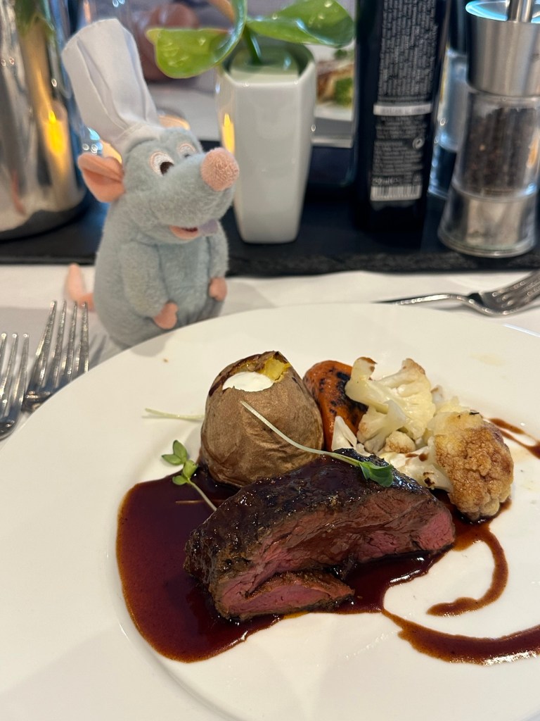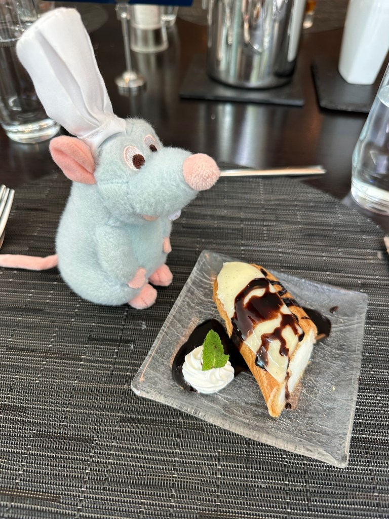 Back on board the ship, it was time for lunch. I sampled the pasta of the day but ultimately went with a classic hamburger—sometimes simple is just right. Remy was absolutely delighted to find a dish of ratatouille, and insisted I try it too. He’s right—it’s always better when someone shares something they love. I finished with a chocolate éclair that I still wish I’d gotten two of.