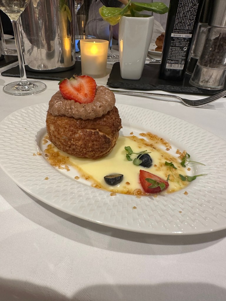 A mixed green salad (which one of my new Kiwi friends hilariously called “alternative lettuce”) Rich, flavorful French onion soup, Lobster, Filet mignon, And Avalon’s signature dessert: a delicate cream puff filled with mixed berries and topped with a silky hazelnut mousse.