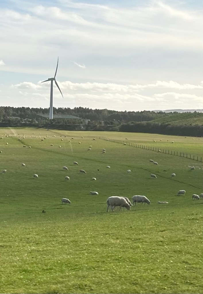 As we drove through the quaint village of Cupar, I caught sight of sheep grazing in a green pasture with a modern windmill standing tall behind them. For a moment, I worried for their health—after all, windmills supposedly cause cancer. 😉 The sheep, of course, were blissfully unconcerned, happily munching away. In truth, wind energy has become a vital part of Scotland’s landscape, a modern chapter blending into the timeless countryside.