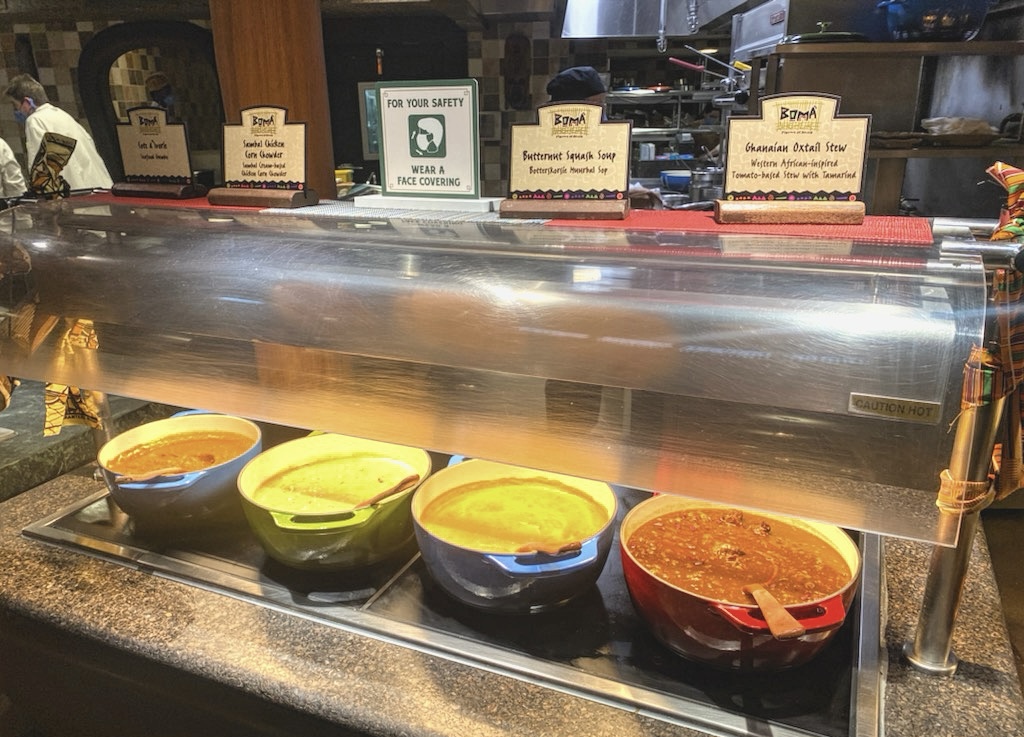 If comfort had a flavor, it would be Boma’s butternut squash soup. Served daily at this rich, vibrant buffet inside Disney’s Animal Kingdom Lodge, it’s creamy, perfectly spiced, and a little bit heart‑warming in every spoonful. The sweetness of the squash balances beautifully with savory notes, and it’s easy to see why this bowl keeps pulling me back.